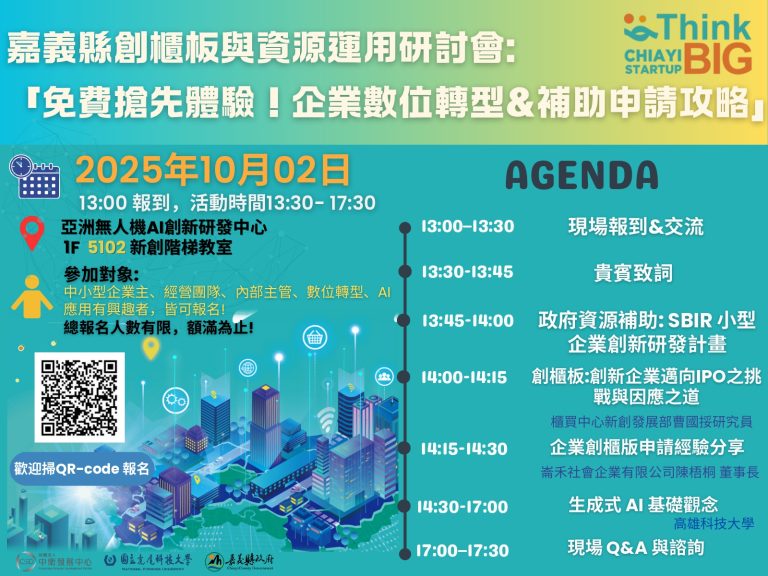 最新消息, 活動資訊2025.10.02 嘉義縣創櫃板與資源運用研討會報名 免費搶先體驗! 趕快報名參加「免費搶先體驗!企業數位轉型&補助申請… Space Chia Yi2025 年 9 月 23 日