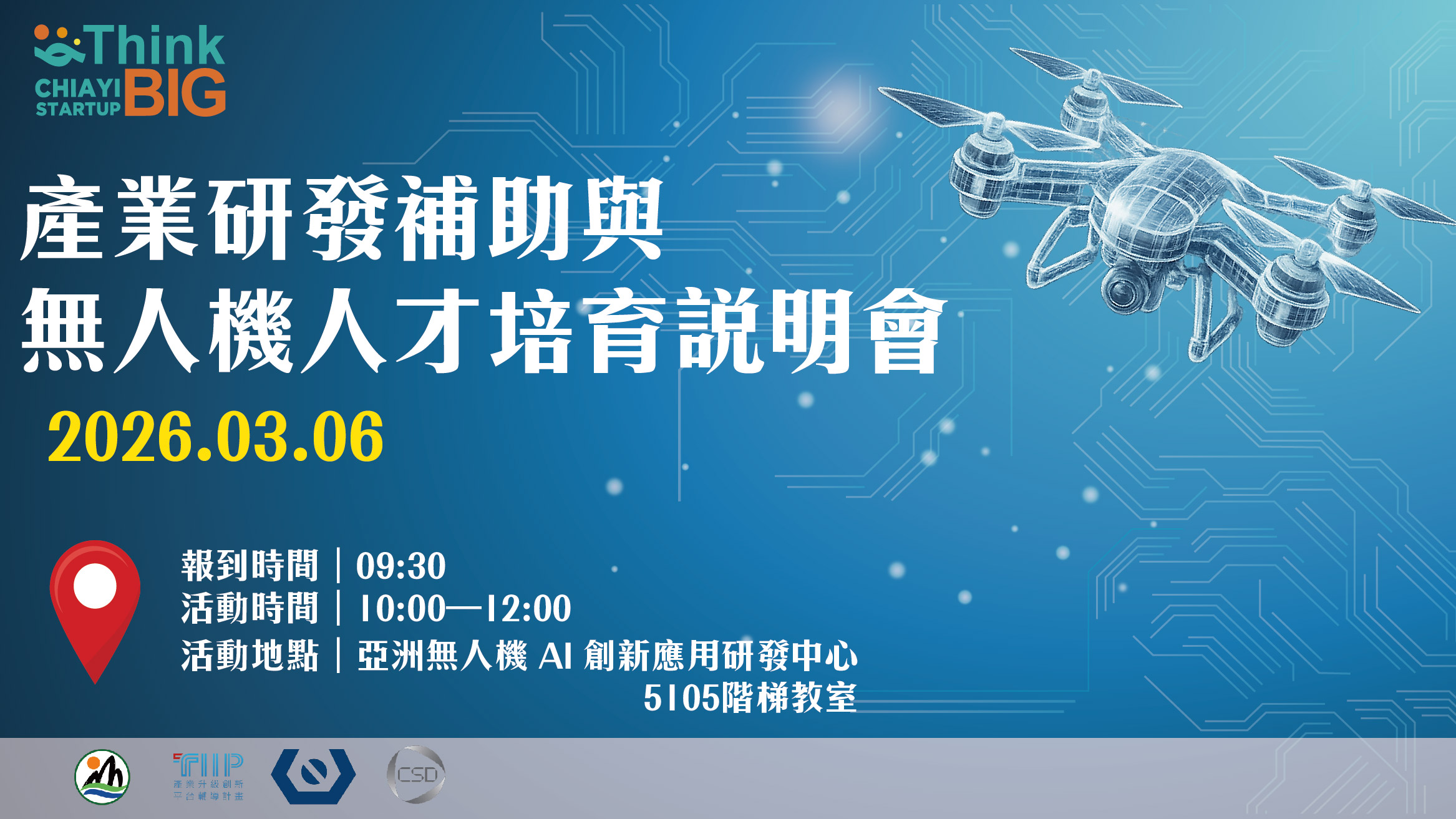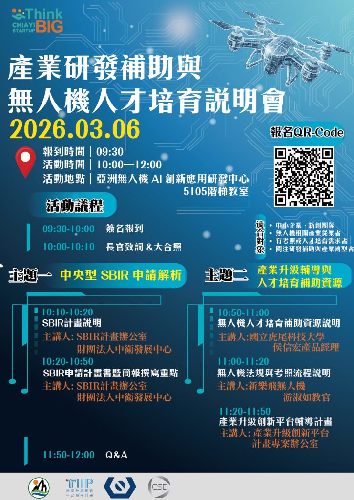 為協助企業與新創團隊掌握政府研發補助資源、加速產業升級與人才培育布局,特舉辦「產業研發補助與無人機人才培育說明會」。本次說明會將聚焦中央型 SBIR 計畫、產業升級創新平台輔導計畫,以及無人機人才培育補助與考照制度,協助業者了解相關政策資源與申請重點。